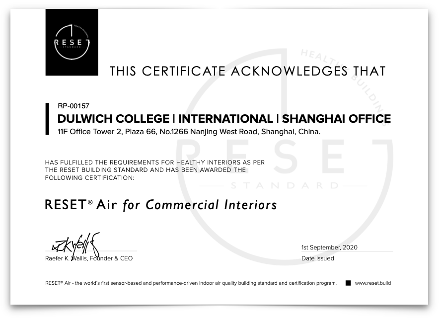 RESET 很高兴地宣布:德威国际教育集团上海办公室于2020年9月1日获得 RESET Air (商业室内 v2.0) 认证。