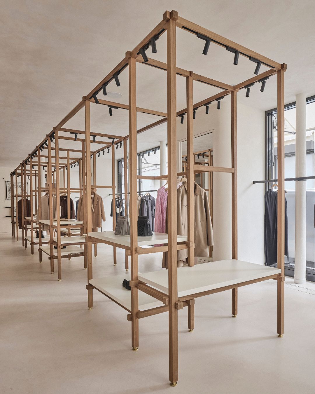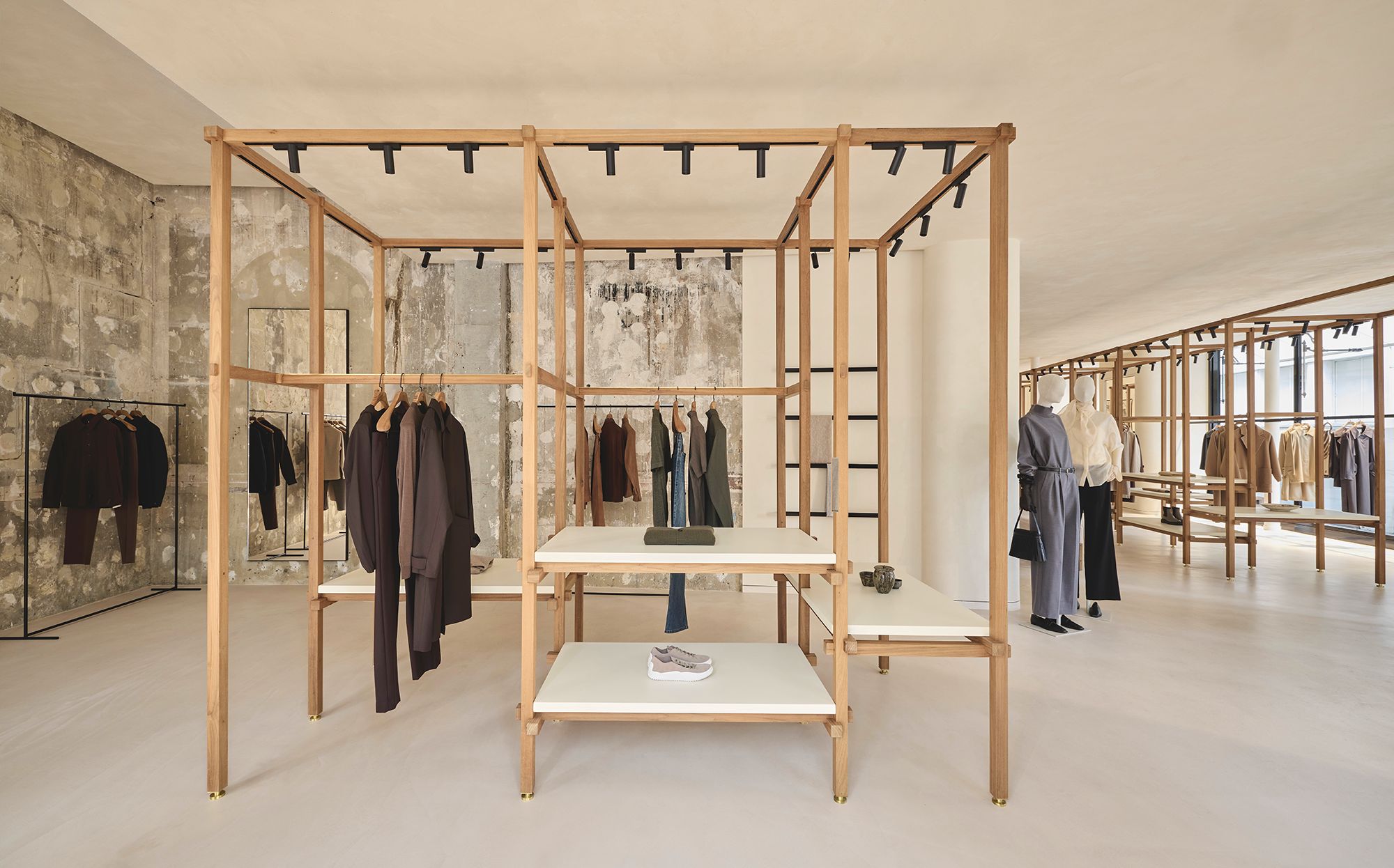 固定木作被控制在最低限度,仅在无法显露结构的区域及私密试衣间周边保留必要部分。