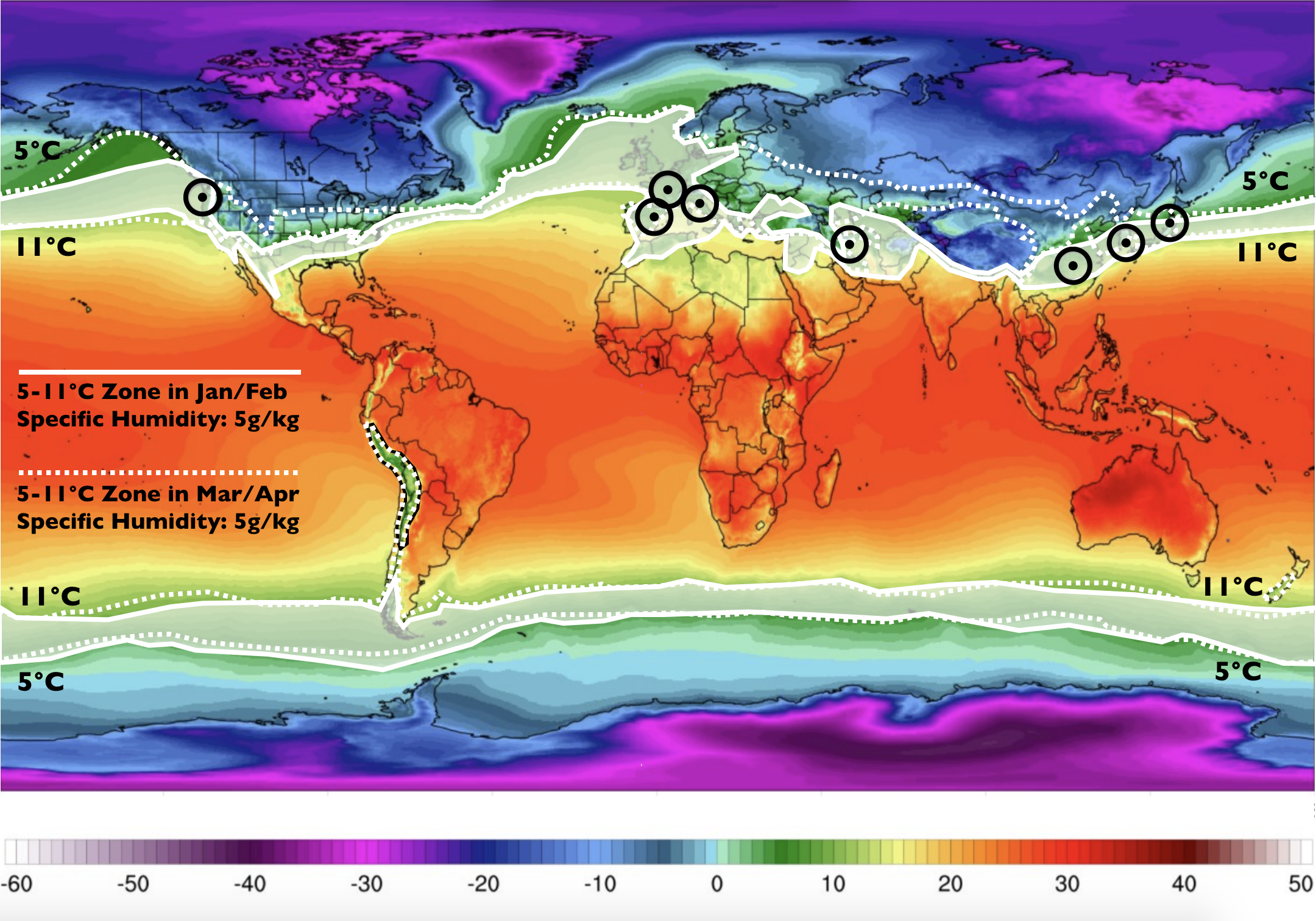 2018年11月至2019年3月全球温度地图,单位为摄氏度。黑色圆圈代表出现显著社区传播的地区 (截止2020年3月10日大于10例死亡病例)。原图来自美国缅因大学气候变化研究所的气候再分析器 (https://ClimateReanalyzer.org)。该图改编自 “温度、湿度和纬度分析以预测COVID-19的潜在扩散和季节性”[6]。
