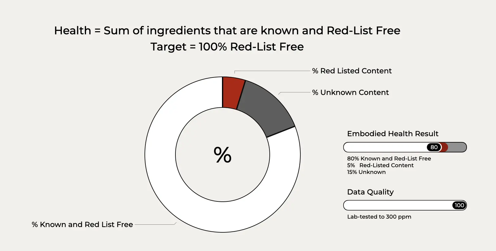 The RESET Embodied Standard calculates the embodied health of projects as the sum of chemicals in all products that are known and free of harmful red-listed ingredients, to a minimum of 300ppm (lab-tested) or 100ppm (supply chain disclosure).